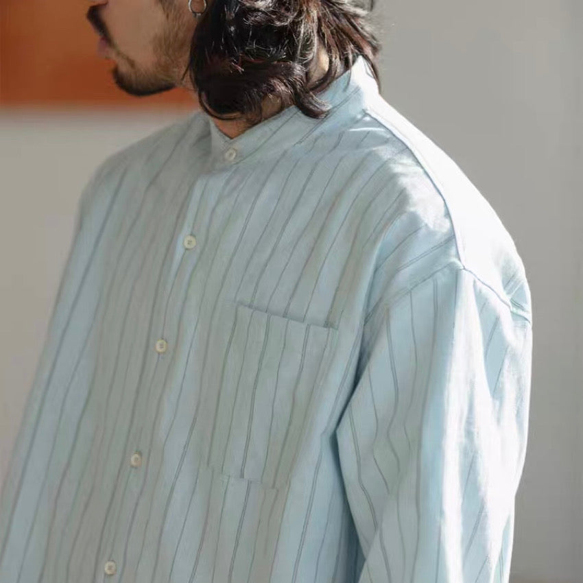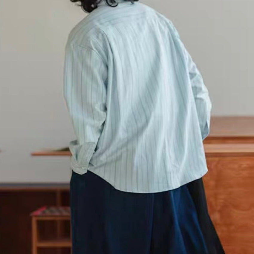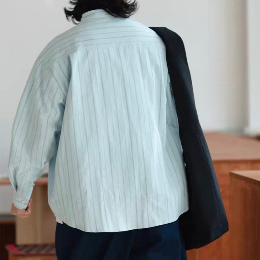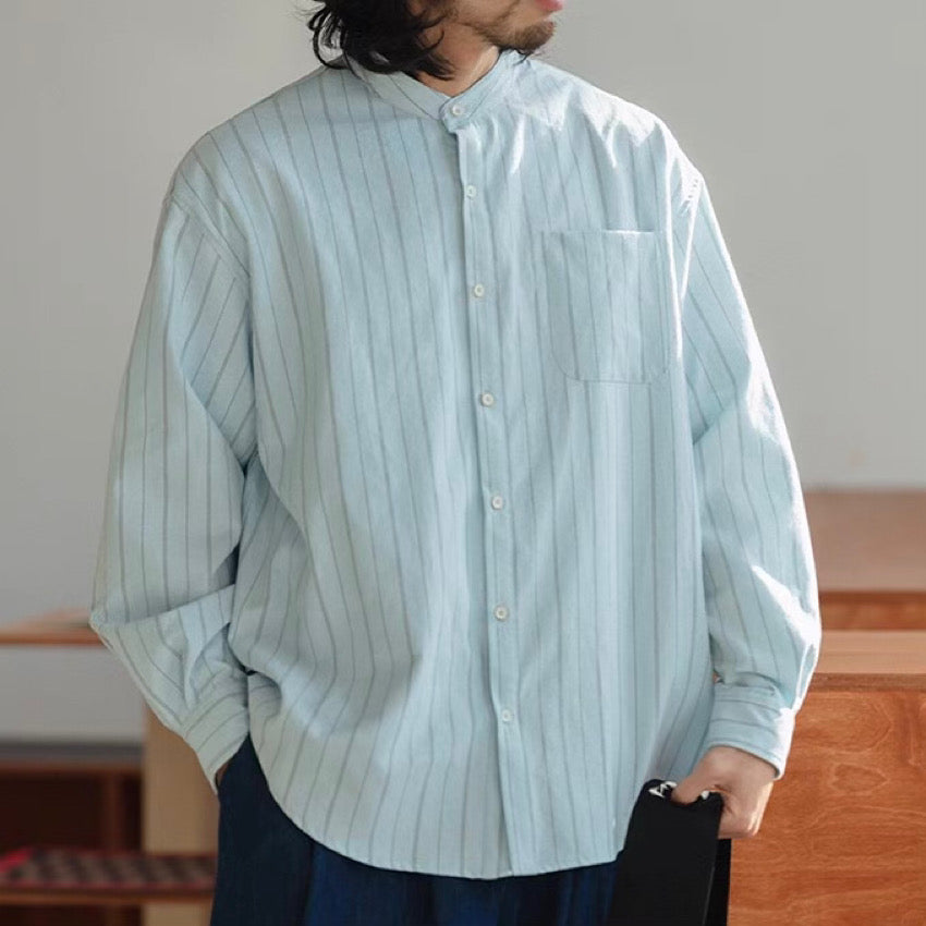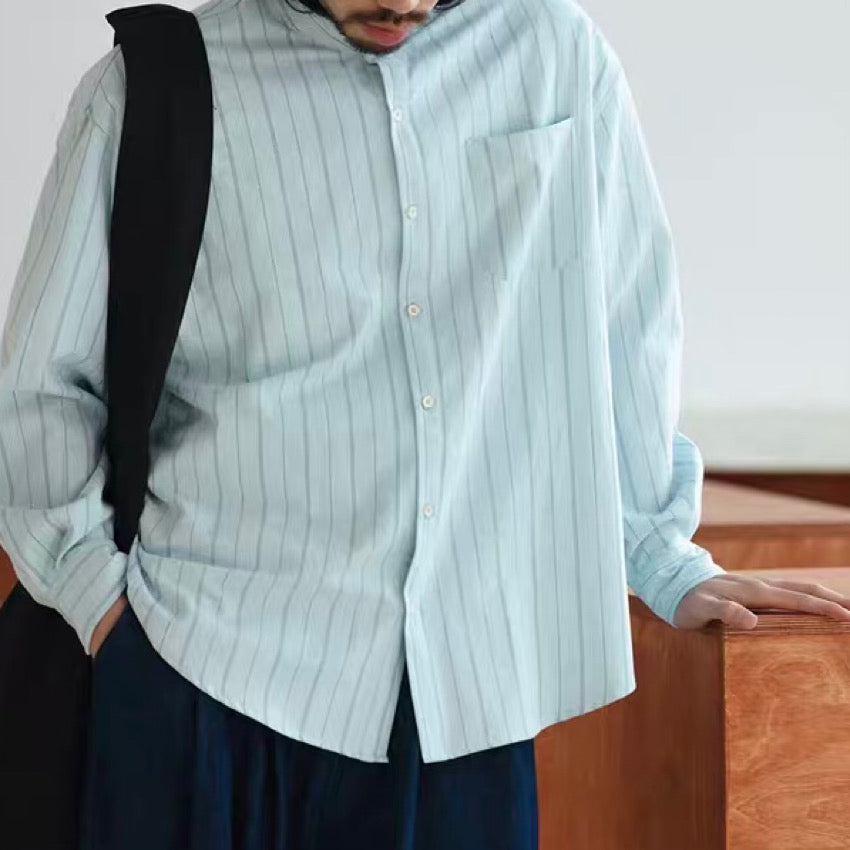 淡いストライプが上品さを演出し、バンドカラーがカジュアルな雰囲気を引き立てます。